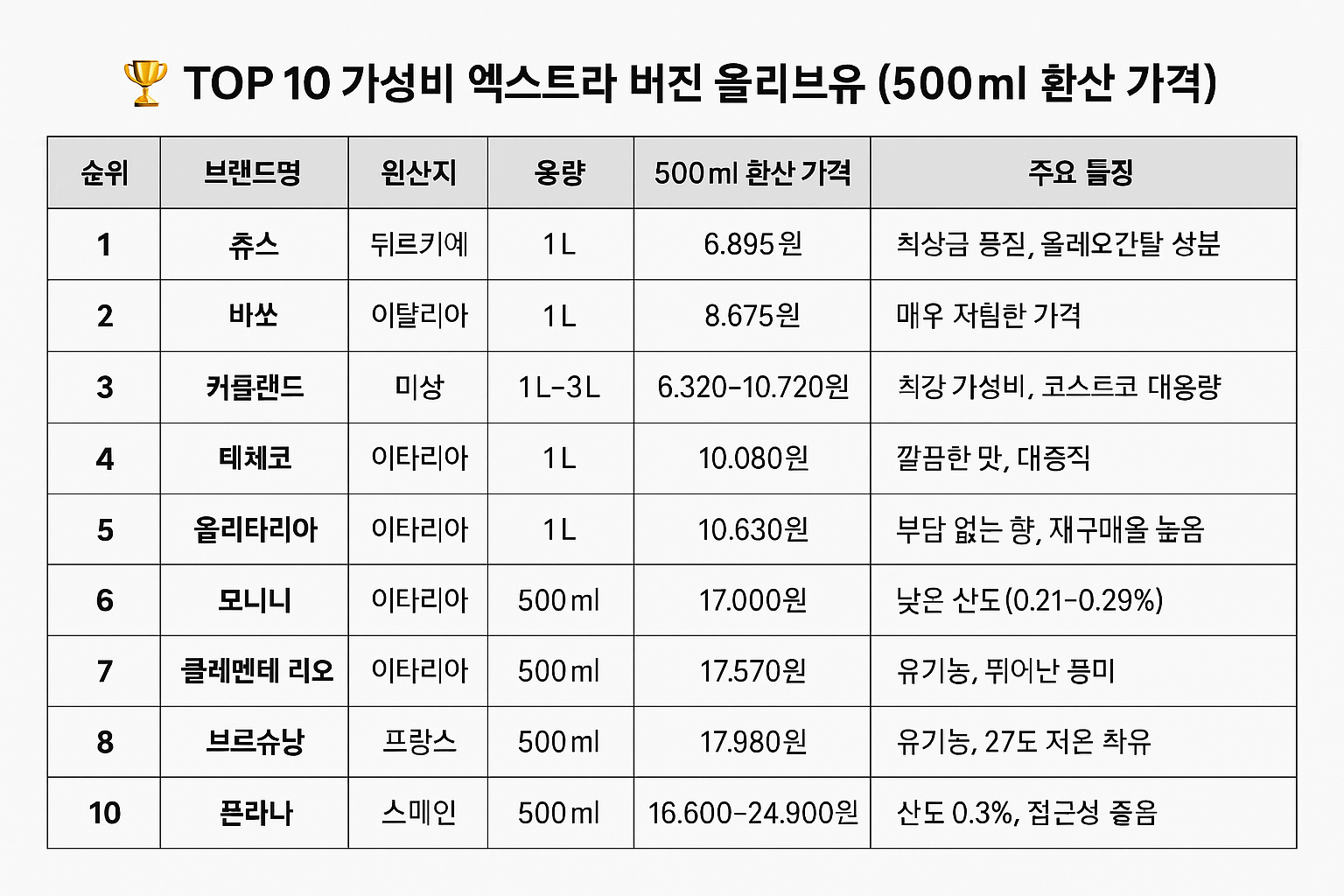 🏆 TOP 10 가성비 엑스트라 버진 올리브유 (500ml 환산 가격)