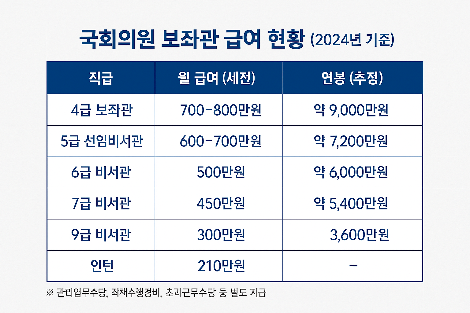 대기업 평균 급여가 1억 196만원 수준임을 고려하면, 보좌관의 급여는 결코 낮지 않은 수준입니다. 특히 6급 비서관의 연봉 5,300만 원은 대기업 신입사원 수준이라고 볼 수 있죠.