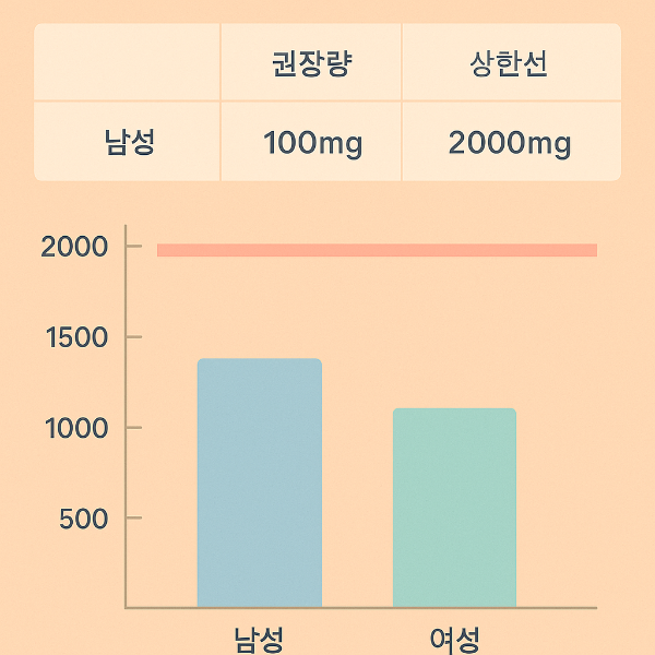 • 상한선: 2,000mg/일 (과다 섭취 시 부작용 위험)