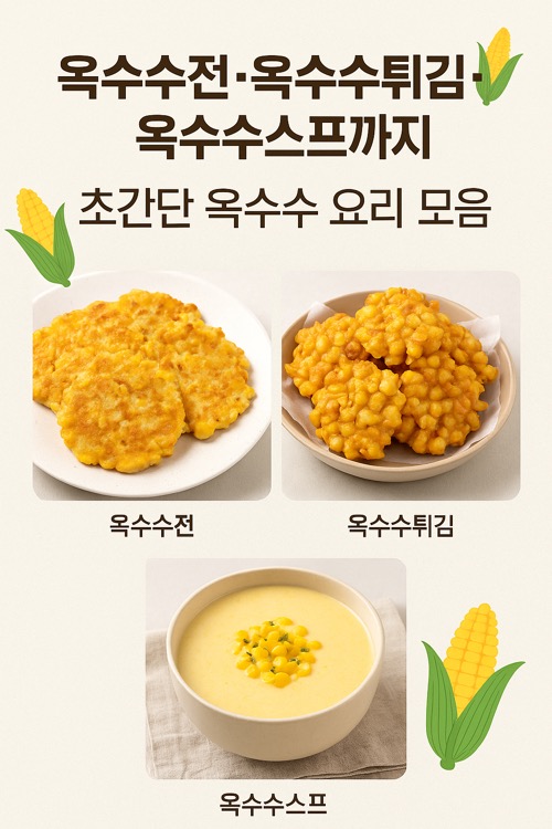 옥수수로 만드는 간단한 집밥 요리 3종 — 옥수수전, 옥수수튀김, 옥수수스프 레시피를 한 번에! 10분~20분이면 완성되는 간식·반찬·아침메뉴.