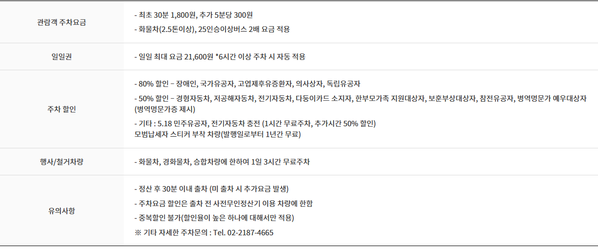 • 일일 최대: 21,600원 (6시간 이상 주차 시 자동 적용)