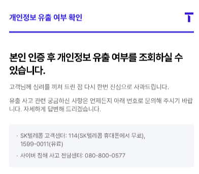 SKT 개인정보 유출 조회 서비스는 4월 18일 해킹 공격으로 유출된 고객 정보를 개별적으로 확인할 수 있는 전용 온라인 서비스입니다. 아래와 같은 문자를 받아보셨을 텐데요. 많이 놀라셨을 듯합니다. T월드 홈페이지를 통해 본인 인증 후 개인정보 유출 여부를 직접 확인할 수 있습니다.